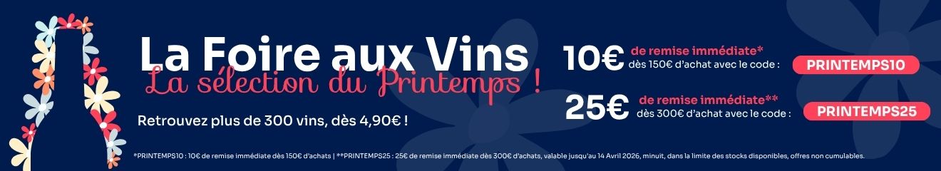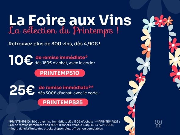 La foire aux vins Wineandco est une opération promotionnelle organisée deux fois par an, généralement en mars-avril pour l'édition printemps et en septembre-octobre pour l'édition automne. Pendant toute la durée de la foire, une sélection spéciale de bouteilles est proposée à des tarifs réduits, négociés directement auprès des producteurs et domaines partenaires. Ce ne sont pas des vins bradés : ce sont des cuvées de qualité, issues de nos meilleurs fournisseurs, proposées à prix exceptionnel le temps de l'opération. Retrouvez aussi en permanence nos promotions en cours sur l'ensemble du catalogue.